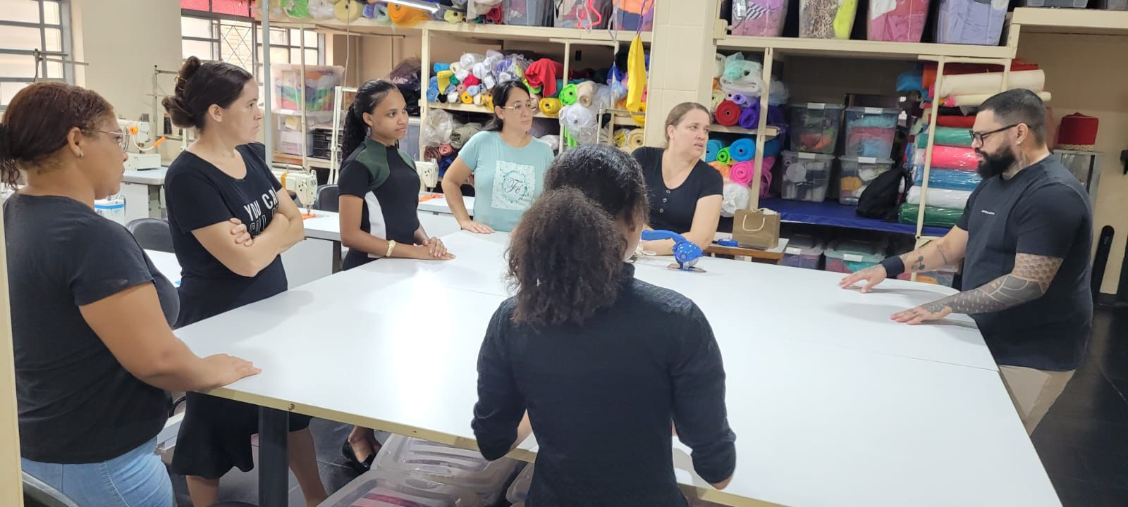 Durante as oficinas, são abordados temas como a escolha correta de tecidos (tules, lycras, poliéster e poliamida), tomada de medidas, modelagem, corte e técnicas de costura à mão e à máquina.