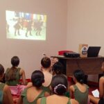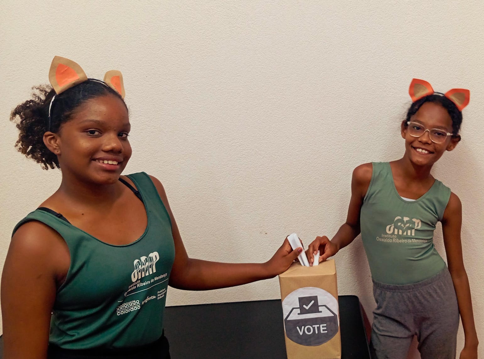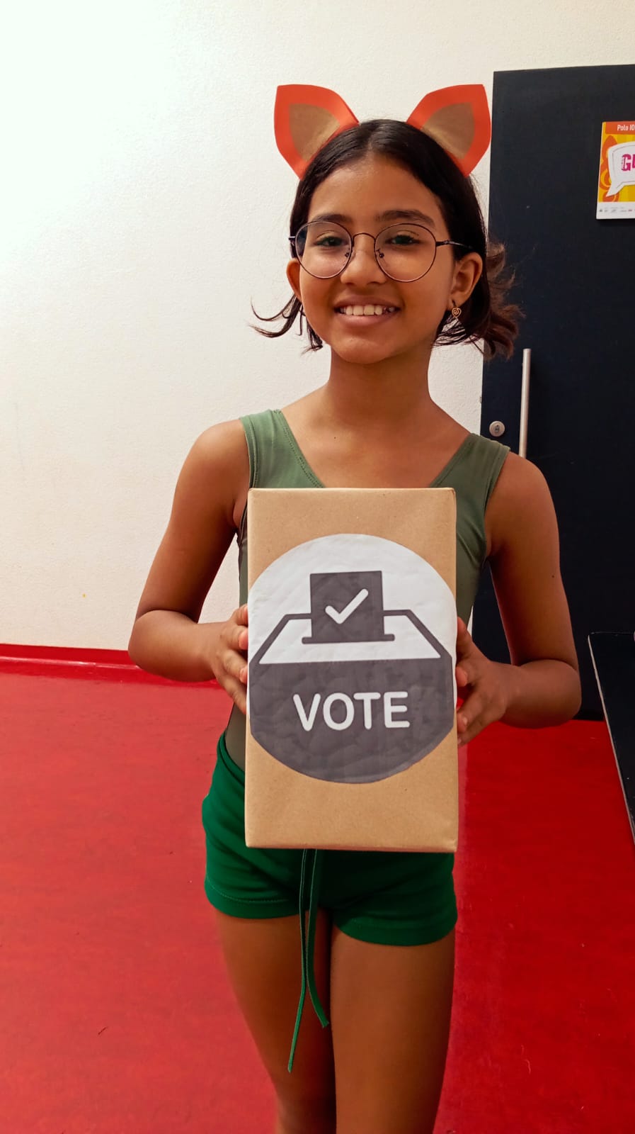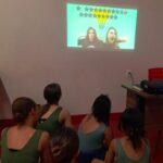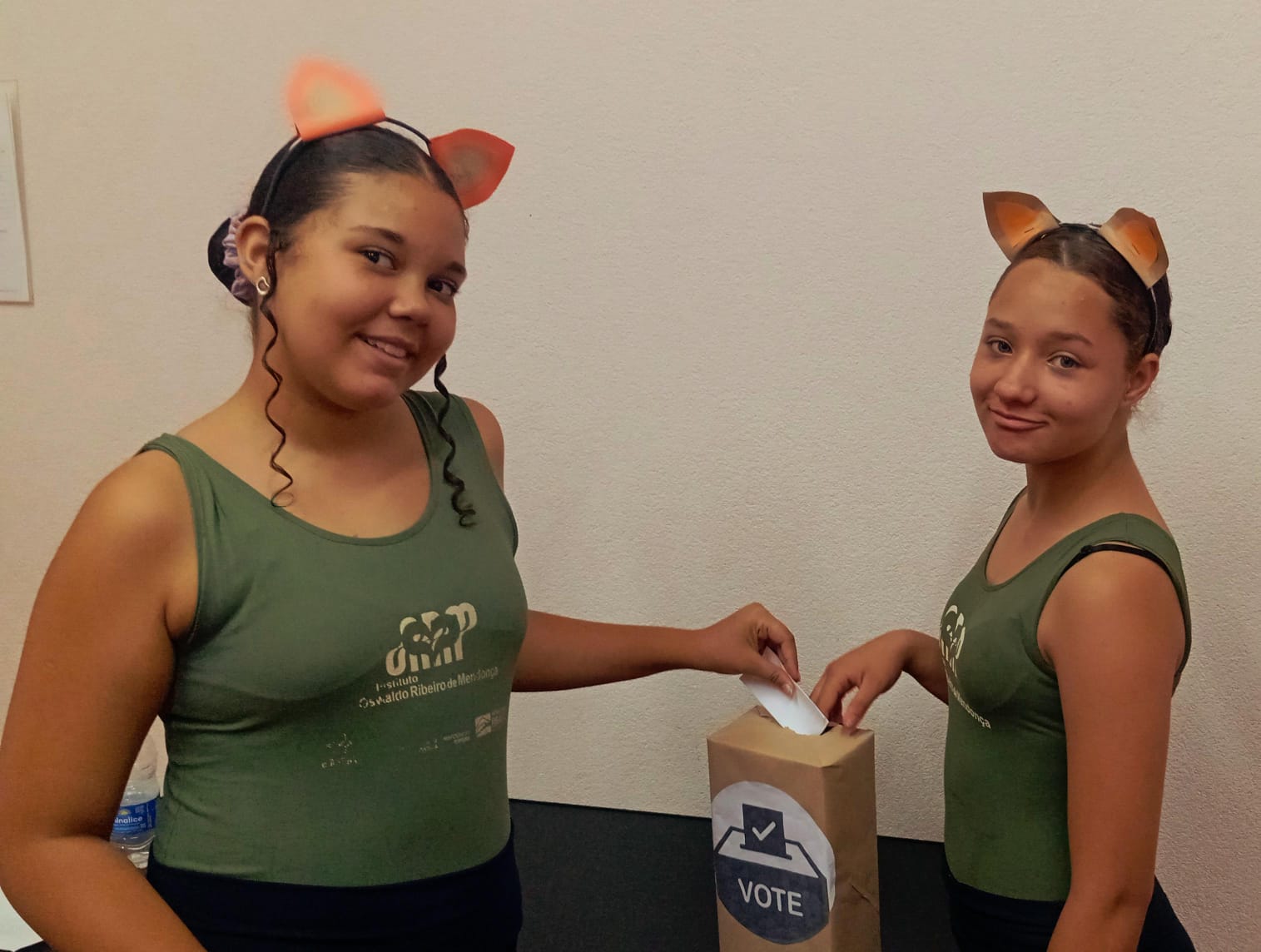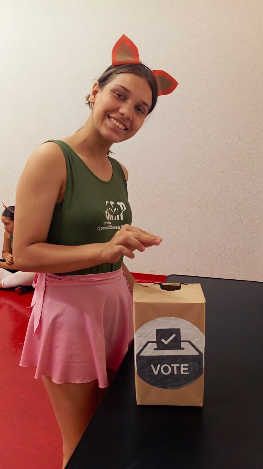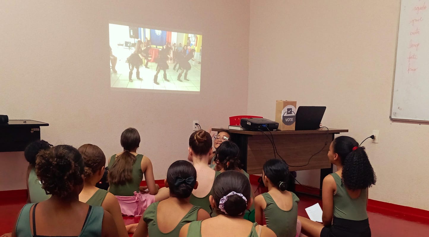 Na etapa prática, os participantes receberam a poesia “O Gato”, de Vinícius de Moraes (1970), e acompanharam a canção de forma lúdica, utilizando tiaras temáticas, o que tornou a experiência ainda mais interativa. Em seguida, assistiram a duas produções audiovisuais com música e dança inspiradas no poema e participaram de uma votação para escolher o vídeo que mais se destacou.