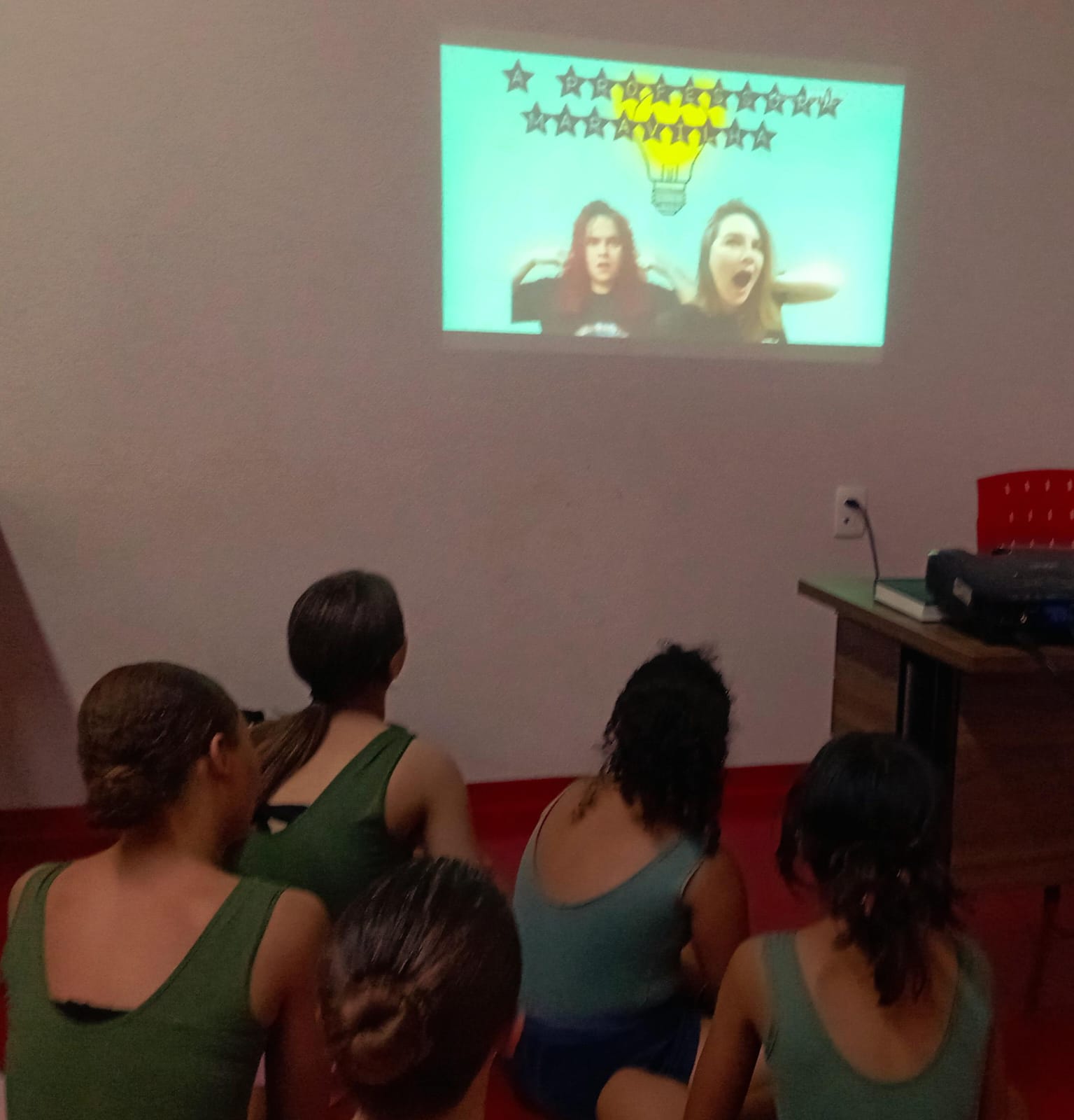 As oficinas foram conduzidas por Maria Laura, responsável pela biblioteca, e tiveram início com a exibição do vídeo introdutório “Verso, estrofe e rima”. Na sequência, os alunos acompanharam uma apresentação explicativa sobre a estrutura do gênero lírico, realizando a leitura coletiva das estrofes, o que estimulou a participação e o envolvimento de todos.