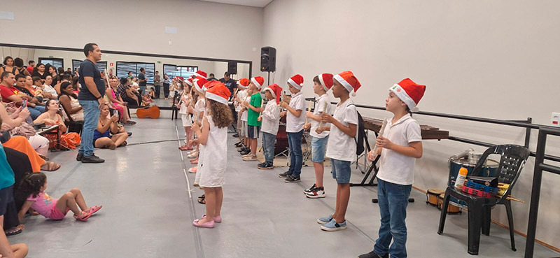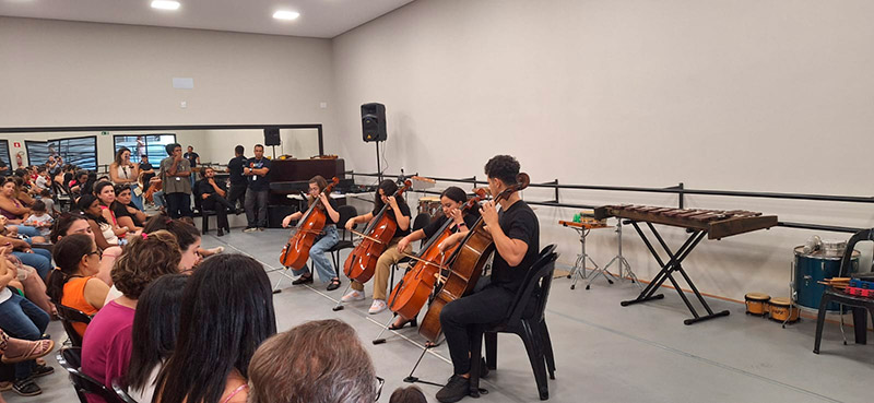 Na tarde de 1º de dezembro, o palco recebeu 69 alunos, com idades entre 6 a 17 anos. Os naipes de Iniciação Musical (Prática Vocal/Rítmico Melódica), Violino, Violoncelo e Percussão encantaram a plateia.